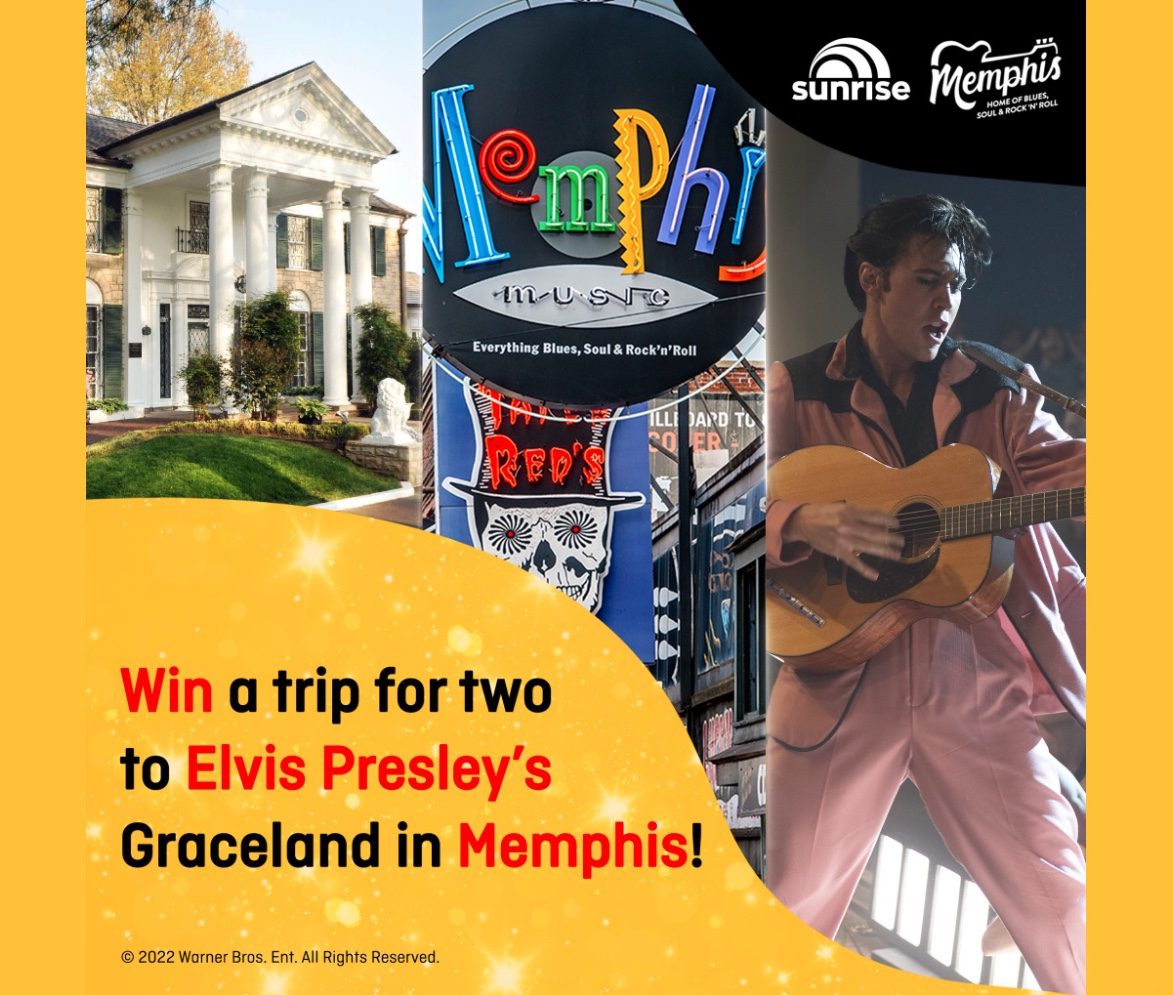 Enter now the new Sunrise Elvis Competition for the opportunity to Win the Ultimate Trip for two to Memphis, the home of Elvis Presley.